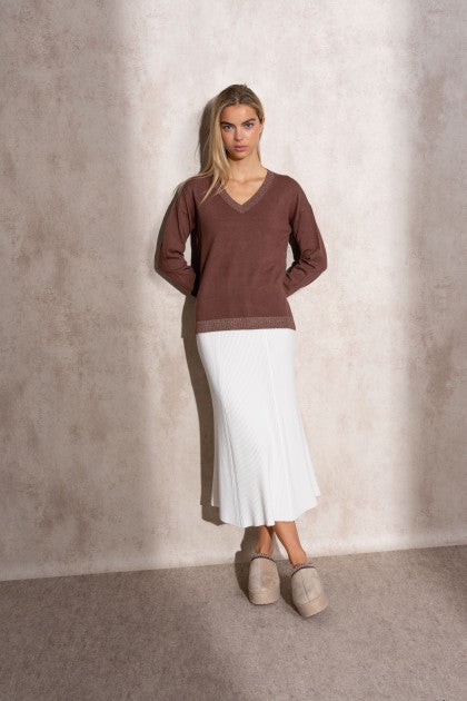 SUÉTER DE PUNTO DE LÚREX CON CUELLO EN V COLOR MARRON