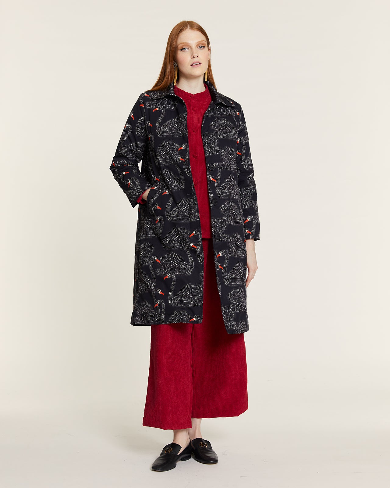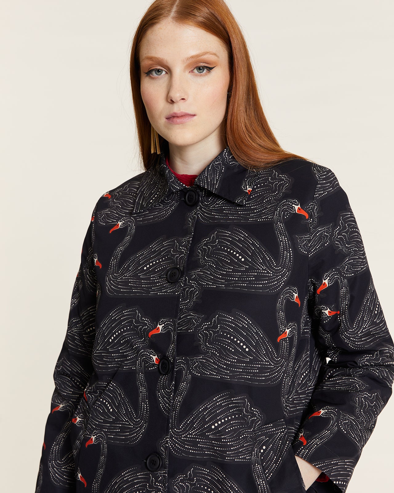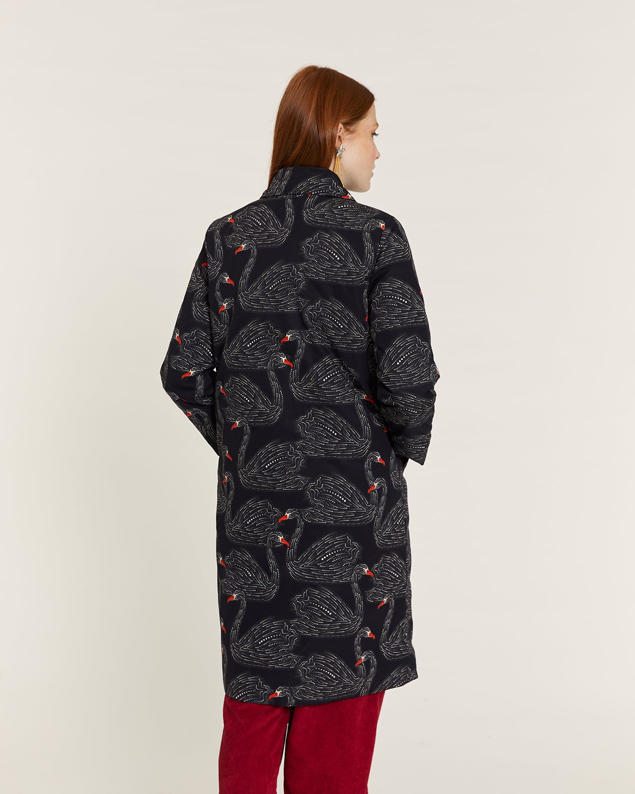 Abrigo de cisnes con forro acolchado, cinco botones, mangas ángel y solapa redondeada tipo peak.