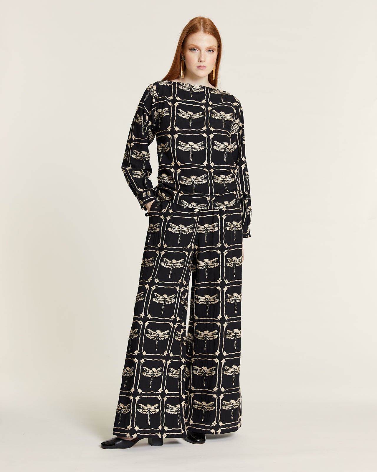 Blusa con bordado de libélulas, mangas largas rectas con puño abotonado y largo a la altura de la cadera.