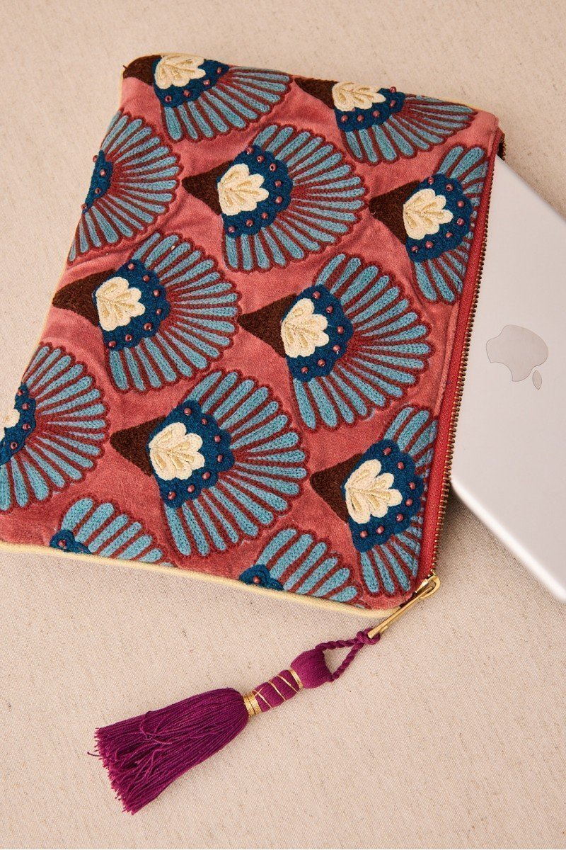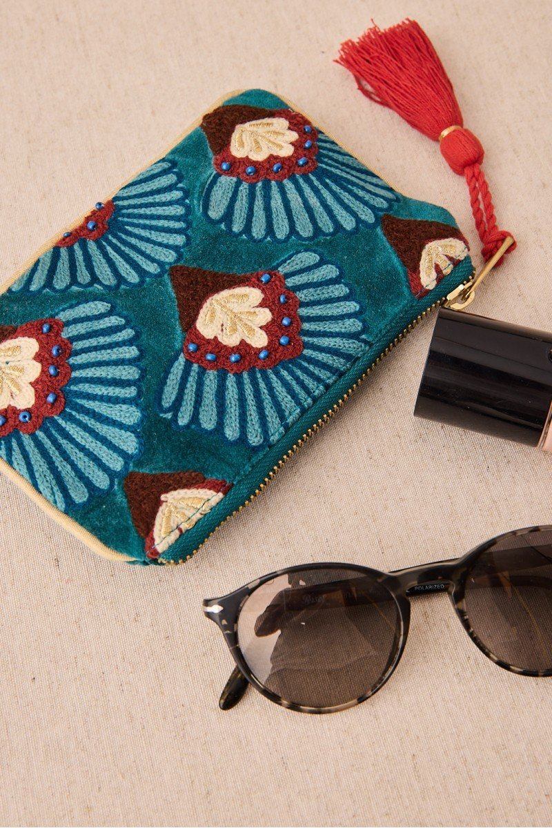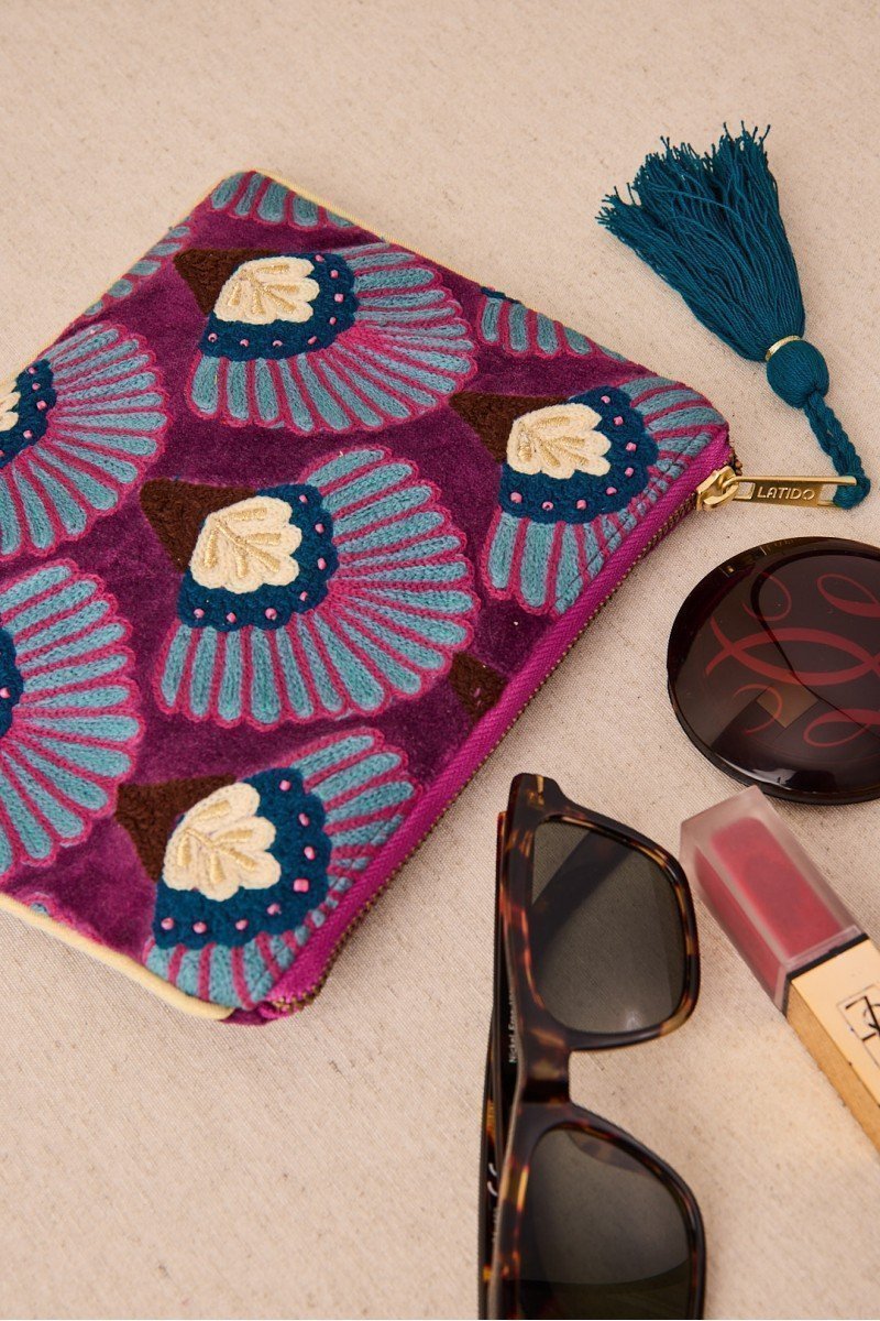 Compacta y con mucho estilo: bolsita de terciopelo con flores bordadas. Su tamaño es perfecto para llevar pequeños esenciales en el bolso o para regalar en invierno.