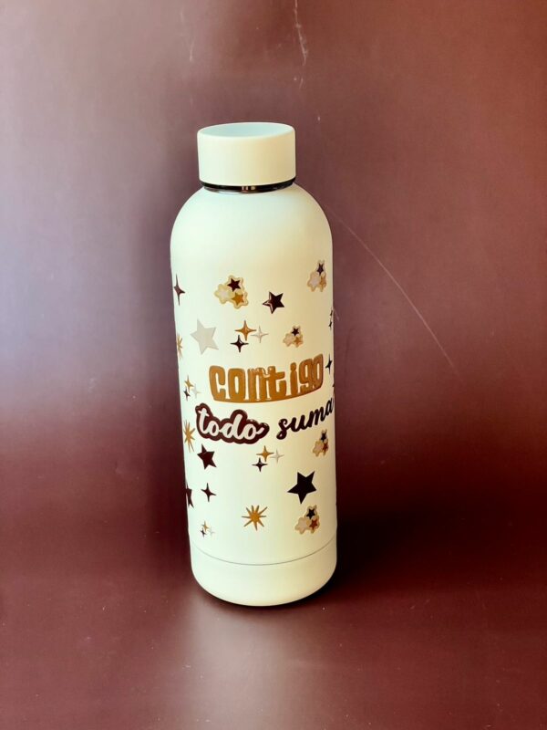 Botella isotérmica de 500ml de capacidad en color crema con el logo «Contigo todo suma» de la nueva colección 2026. Decoración mediante DTF.