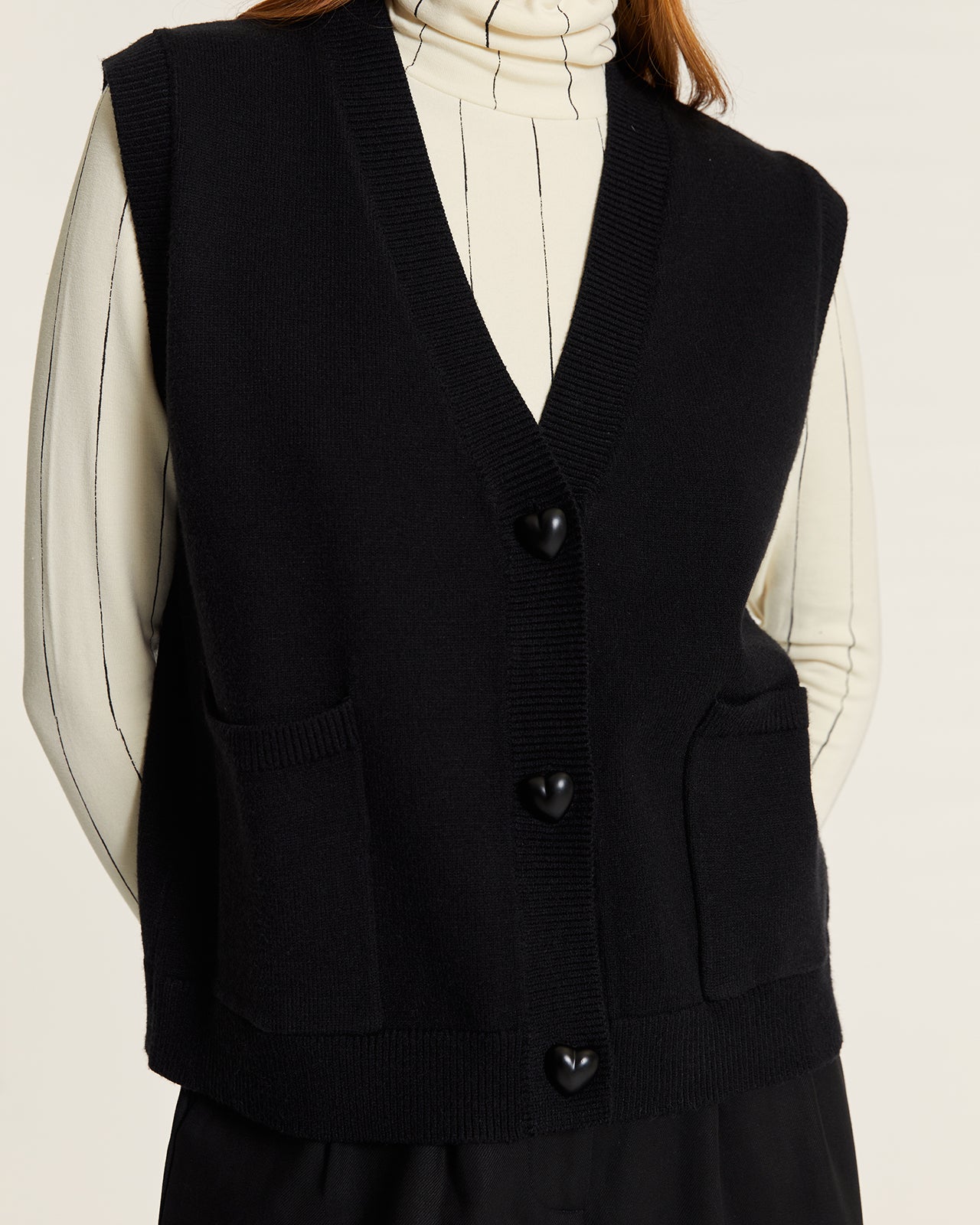 Chaleco de punto con botones de corazón negro, sin mangas, escote de pico , a la altura de la cadera.