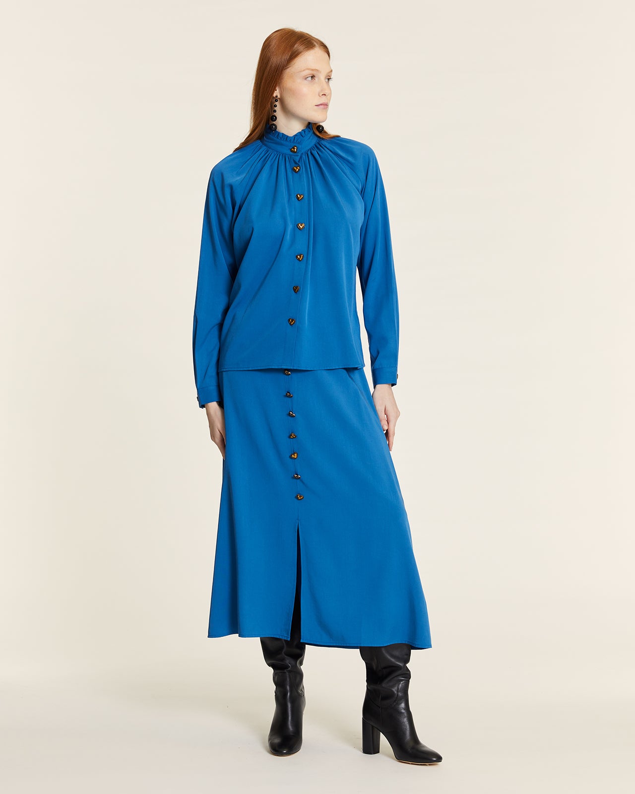 Falda evasé con abertura central delantera, cinturilla rígida sin elasticidad y botones decorativos en forma de corazón que aportan un toque dulce y femenino.