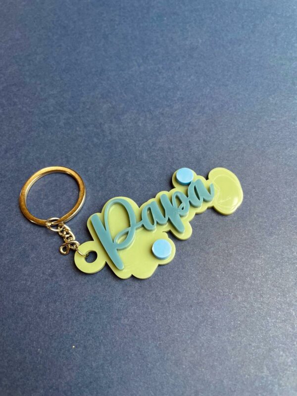 Llavero de metacrilato en tonos verde oliva y azules , de la nueva colección de Papá.