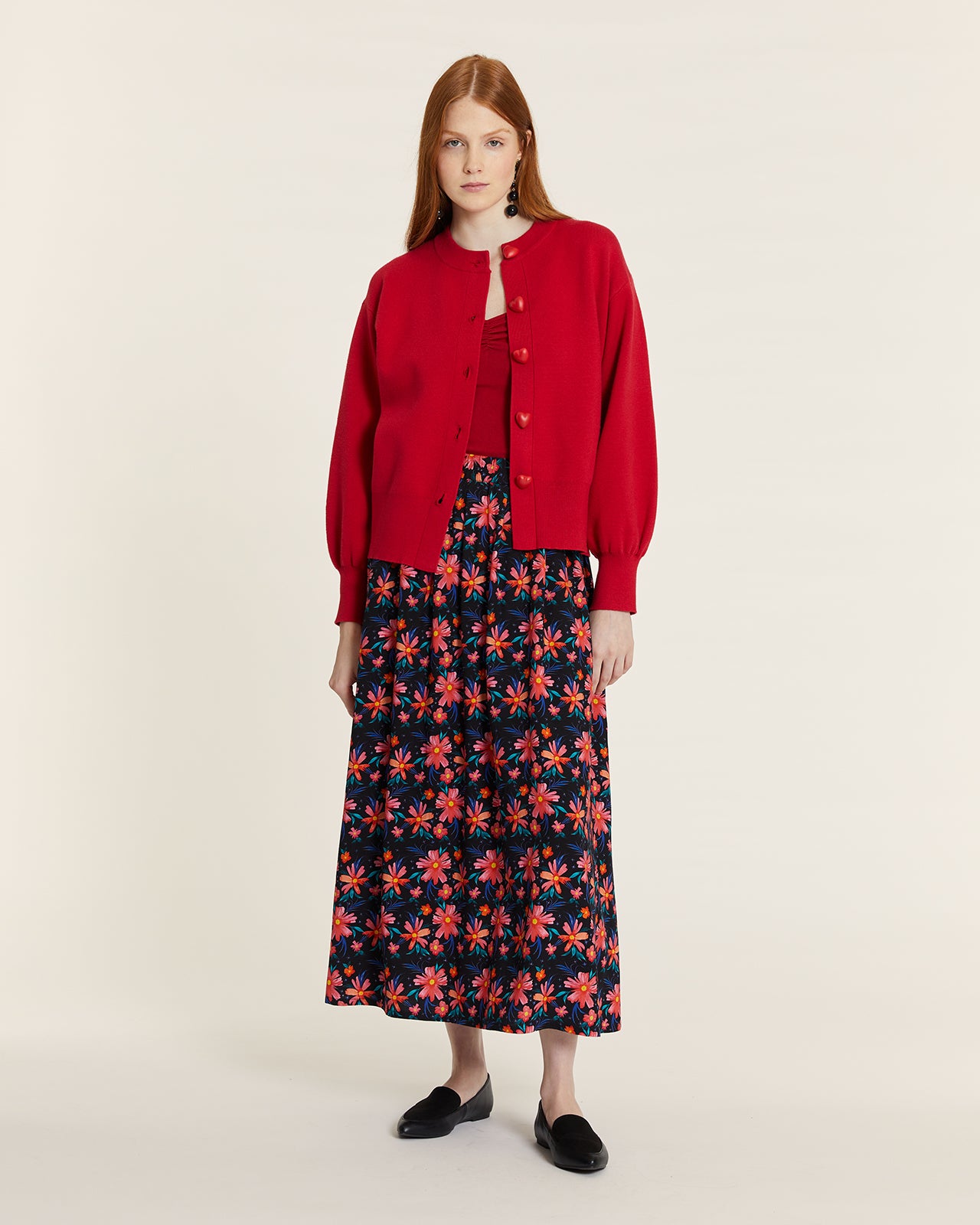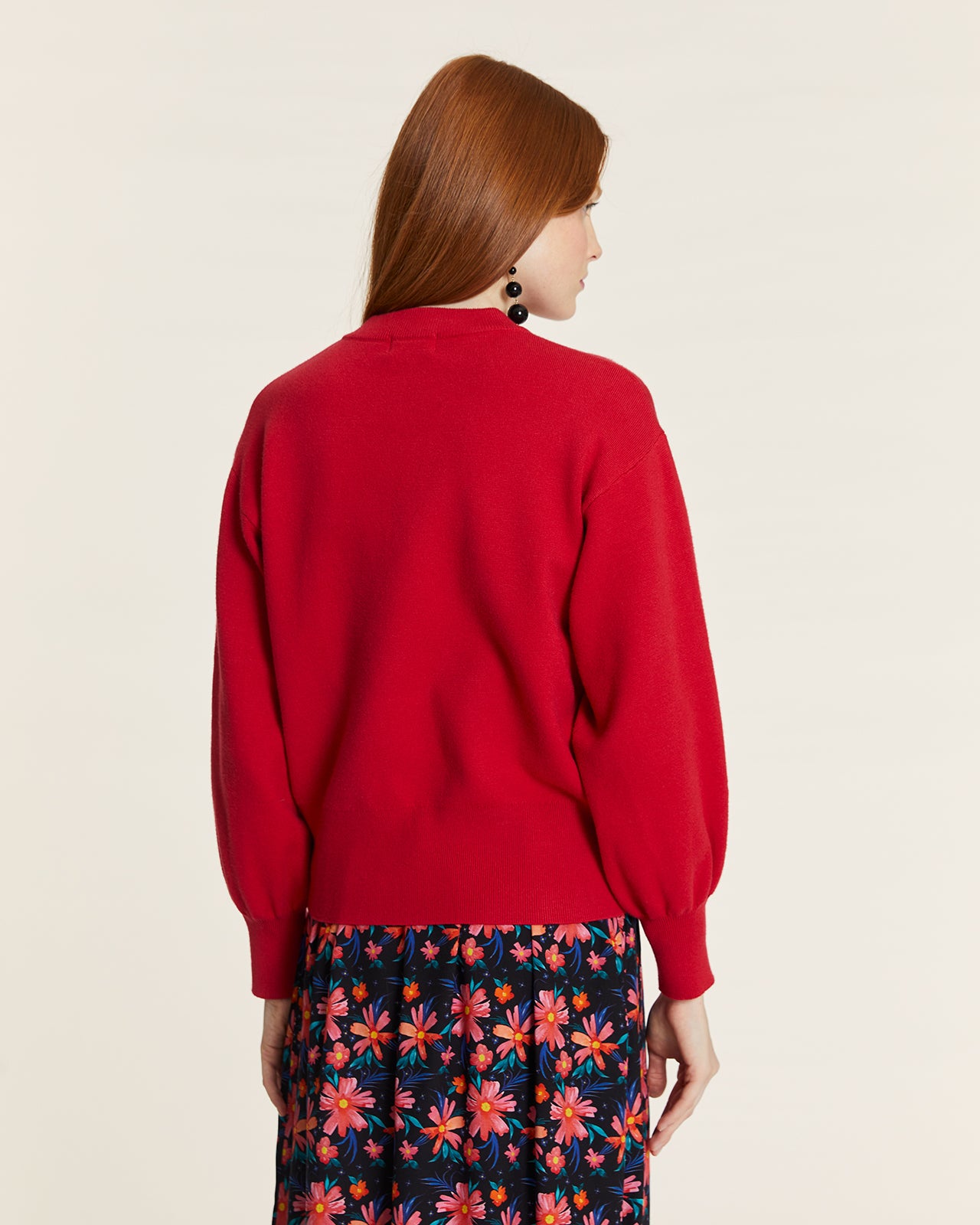 Rebeca con botones de corazón rojo, mangas rectas largas, puño shirred, escote redondo, a la altura de la cadera.