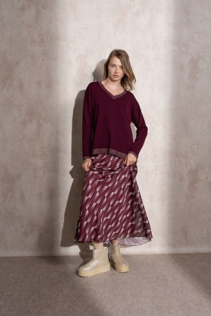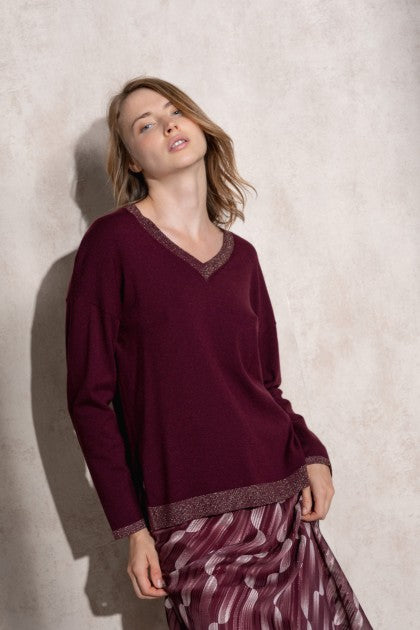 SUÉTER DE PUNTO DE LÚREX CON CUELLO EN V COLOR BERENJENA