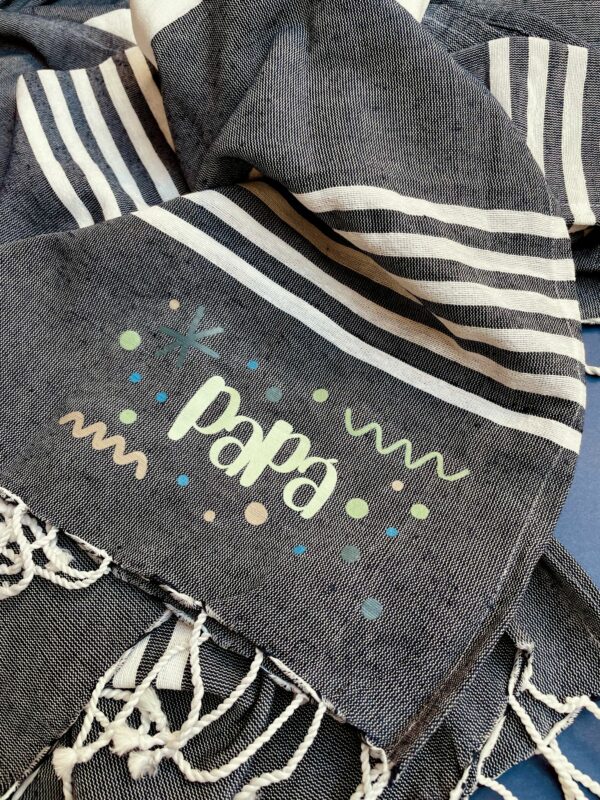 Toalla 100% algodón de la colección de «Papá» de color azul marino y blanca. Lleva flecos blancos en los extremos de ambos lados. Logo mediante estampación textil DTF.