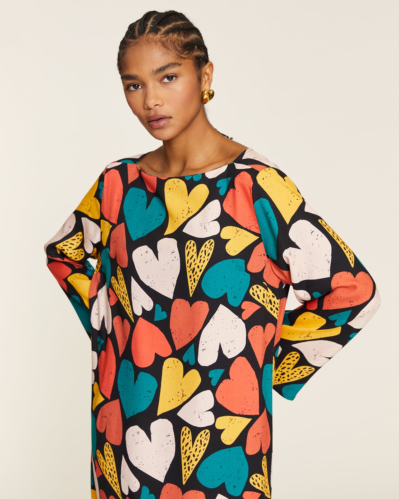Vestido largo con abertura en los laterales. Mangas tipo ángel.