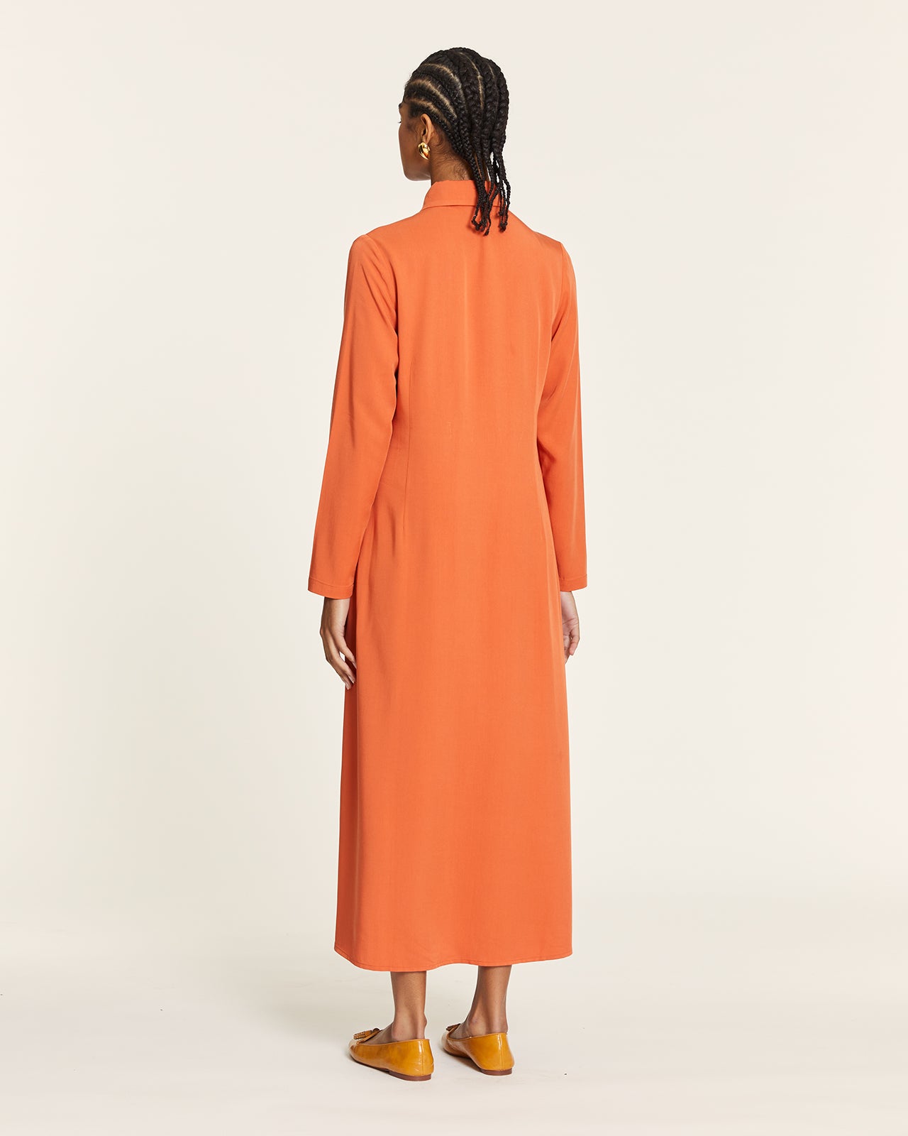 Vestido largo con botones en forma de corazón, escote en pico, fruncido delantero en X, mangas raglán rectas y puños bishop.
